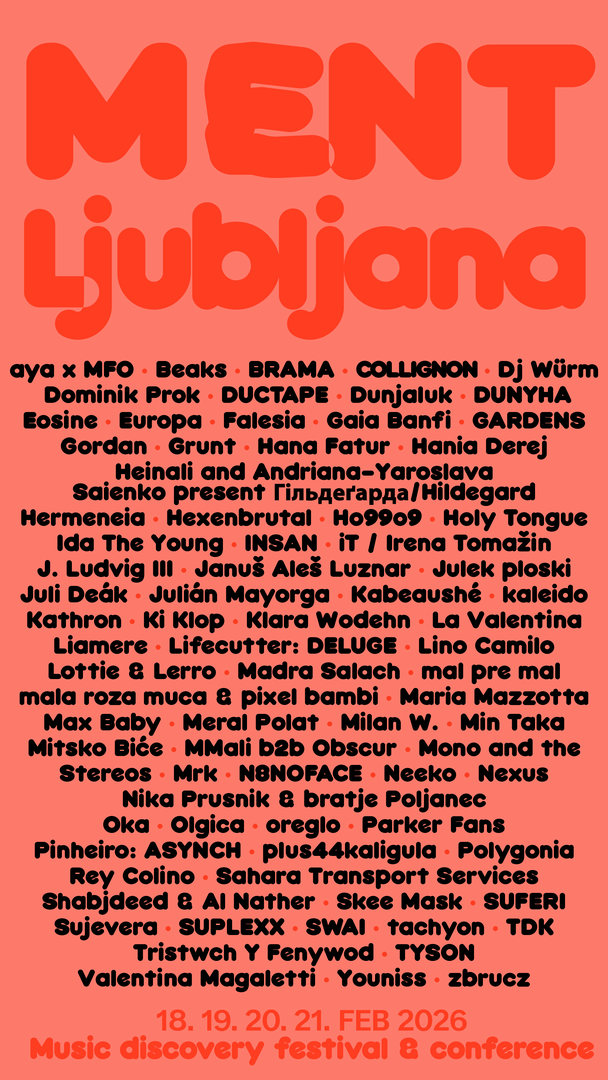 Natančen program najdete na njihovi uradni spletni strani, zagotovo pa vam med 18. in 21. februarjem ne bo žal, če se udeležite dogajanja. Na uredništvu že rolamo playlisto MENT 2026 PLAYLIST - Listen on Youtube, Spotify, Apple Music - Linktree. Se vidimo na MENTU!