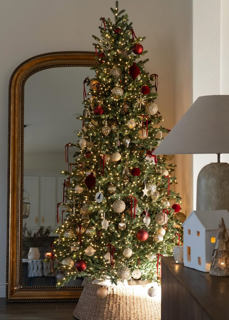 Ustvarite občutek severnoevropske zime s srebrnimi, belimi in rdečimi poudarki. Drevo zaključite z nežnim vrhom v obliki šopka rdečih jagod, ki poskrbi za očarljivo, a še vedno sodobno noto.