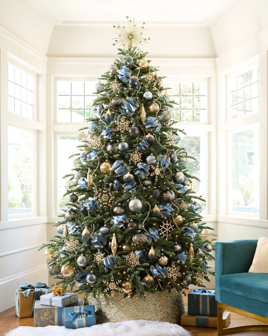 Ujemite lepoto zvezdnate noči s kombinacijo globokih modrih odtenkov in bleščečih poudarkov. Drevo okrasite s temno modrimi in srebrnimi okraski, ki ustvarijo videz jasnega nočnega neba, nato pa dodajte bleščeče dekorativne vejice, ki v prostor vnesejo iskrivo vzdušje zaledenelega gozda.