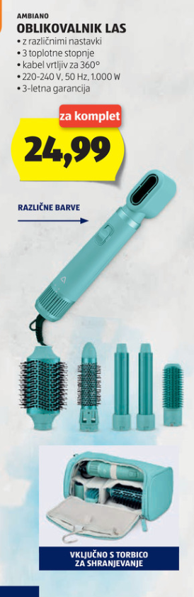 Oblikovalnik las v različih barvah s tremi toplotnimi stopnjami, različnimi nastavki in vrtljivim kablom znamke Ambiano stane le pičlih 24,99 evrov, kar je v primerjavi z Dyson Airwrapom pravi drobiž. Skupaj z izdelkom dobite celo torbico za shranjevanje.