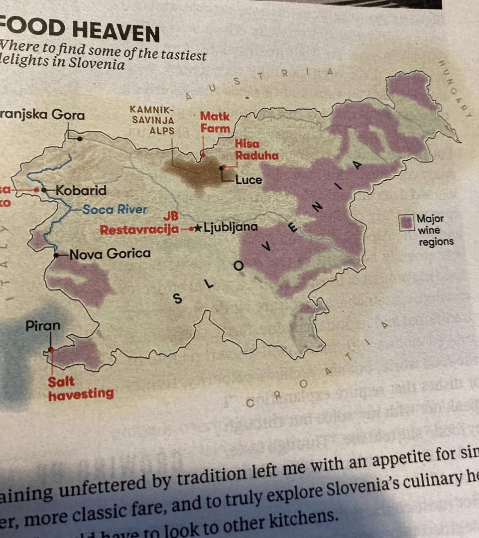 "Vsaka kultura ima svojo kulinariko, ki pripoveduje njeno zgodbo. Slovenija — drobna država, velika približno toliko kot New Jersey, vendar z manj kot četrtino njegovega prebivalstva — ima veliko zgodb za povedati," je zapisala v uvodu in nadaljevala: "Država, obdana z Italijo, Avstrijo, Madžarsko in Hrvaško, se ponaša z izjemno raznoliko pokrajino. V nekaj urah vožnje lahko doživite širok spekter evropskih lepot in arhitekture, od alpskih jezer in srednjeveških gradov do jadranskih plaž, obdanih z rdečimi strehami vil in nasadi oljk."