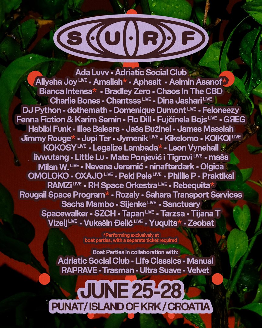 Surf Festival presega klasičen festivalski format in si prizadeva premostiti vrzel med visoko produkcijo in lokalnim kontekstom. Dnevni program se odvija na odru Piknik, popoldnevi so namenjeni boat partyjem v skritih zalivih otoka Krka, večeri pa se selijo na kultno plažo Medane, kjer je poudarek na vrhunskem avdio-vizualnem doživetju. Poleg glasbe festival vključuje tudi listening sessione, vodene pohodniške ture po kršu, panelne diskusije ter delavnice plesa, giba in joge, s čimer ustvarja večplastno festivalsko izkušnjo, ki presega zgolj koncertni program.