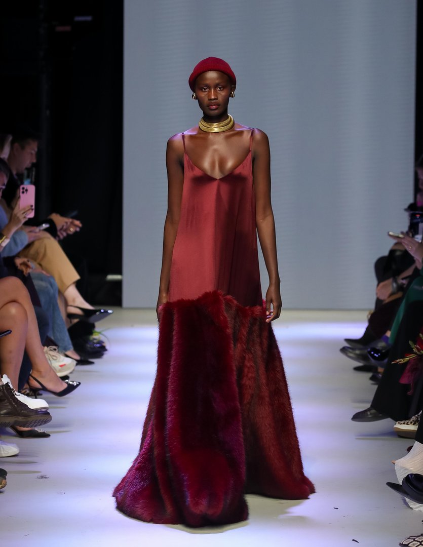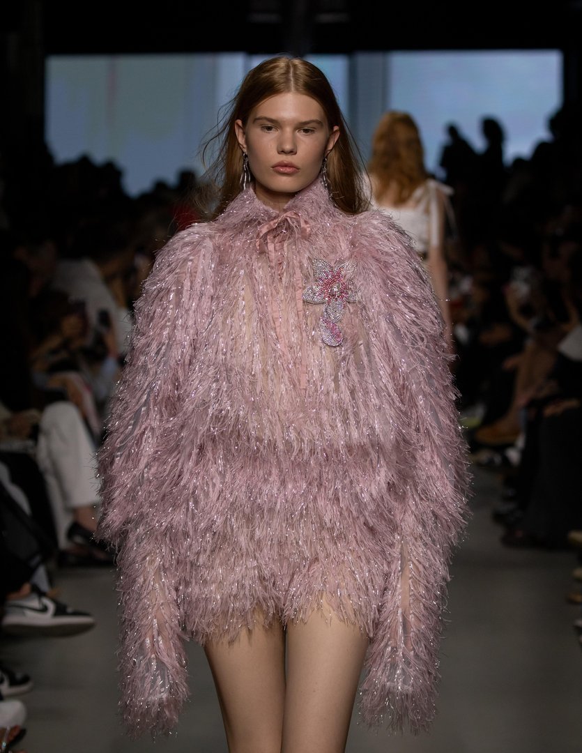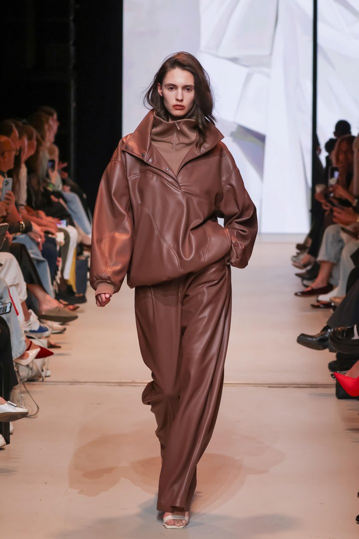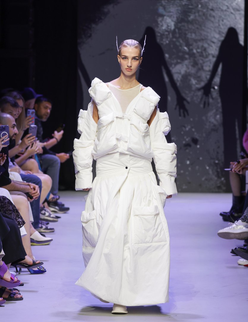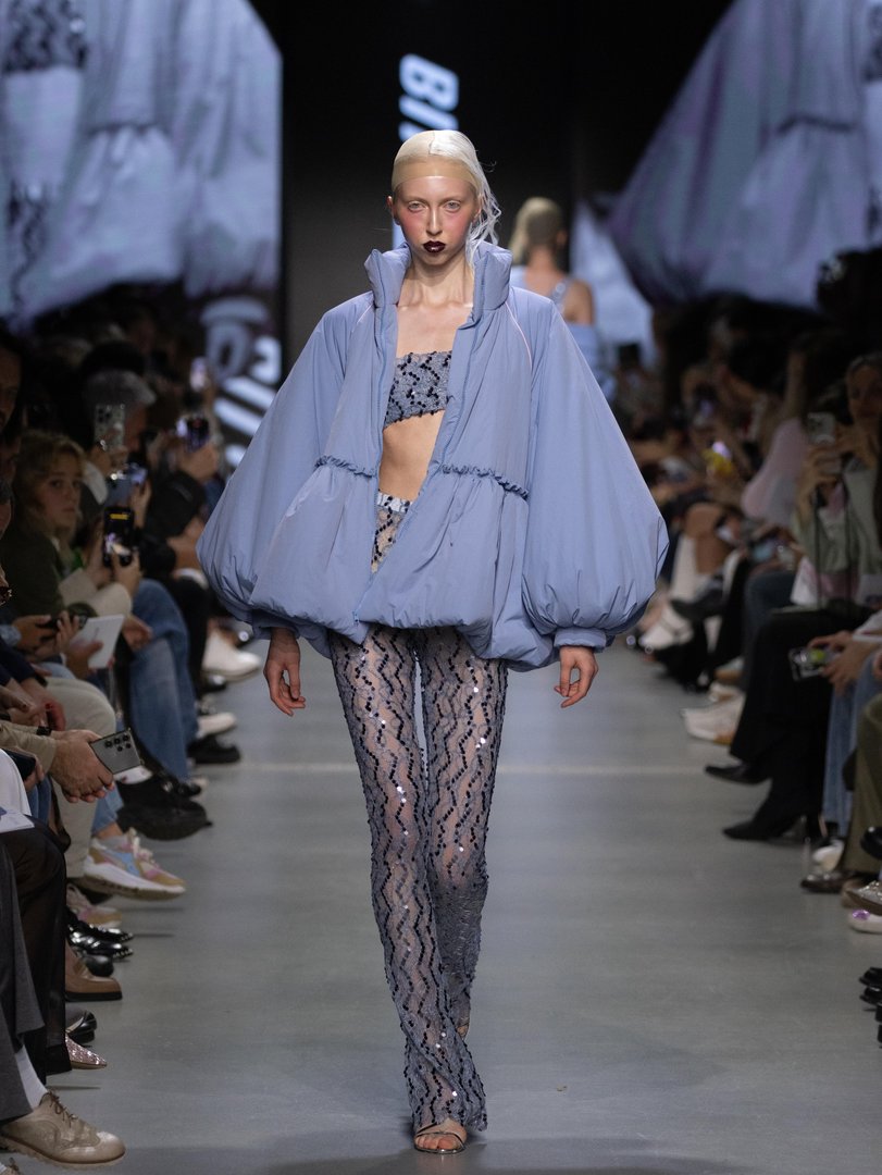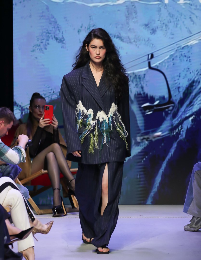 Iz prvih vrst smo se za nekaj minut preselili v glamurozni Courchevel, na lesketajoči sneg in kuhano vino. No, 'žal' samo v burni domišljiji, ki jo je z atmosfero in scenografijo črtastih ležalnikov in šampanjca pričarala Yana Besfamilnaya. Prireditveni prostor se je za hip ovil v estetiko kultnega après-ski dogajanja, kolekcija pa tudi - vključevala je kombinacije zimskih puhastih jaken, puloverjev in vezenih alpskih motivov.