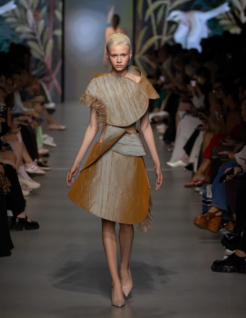 S pomenljivim naslovom kolekcije Nočni vrt je oblikovalka ostala zvesta svojemu kreativnemu motu: najti neobičajno obliko ali silhueto. Navdušila nas je njena sposobnost poudariti lepoto ženskega telesa in hkrati ustvariti harmonično sožitje z naravo. Ideja se je v oblačilih zrcalila preko silhuet, navdahnjenimi z oblikami dreves in cvetov, cvetličnih motivov, naravnih barv in večplastnih tkanin.